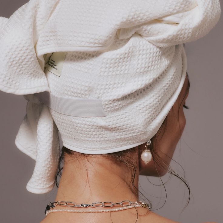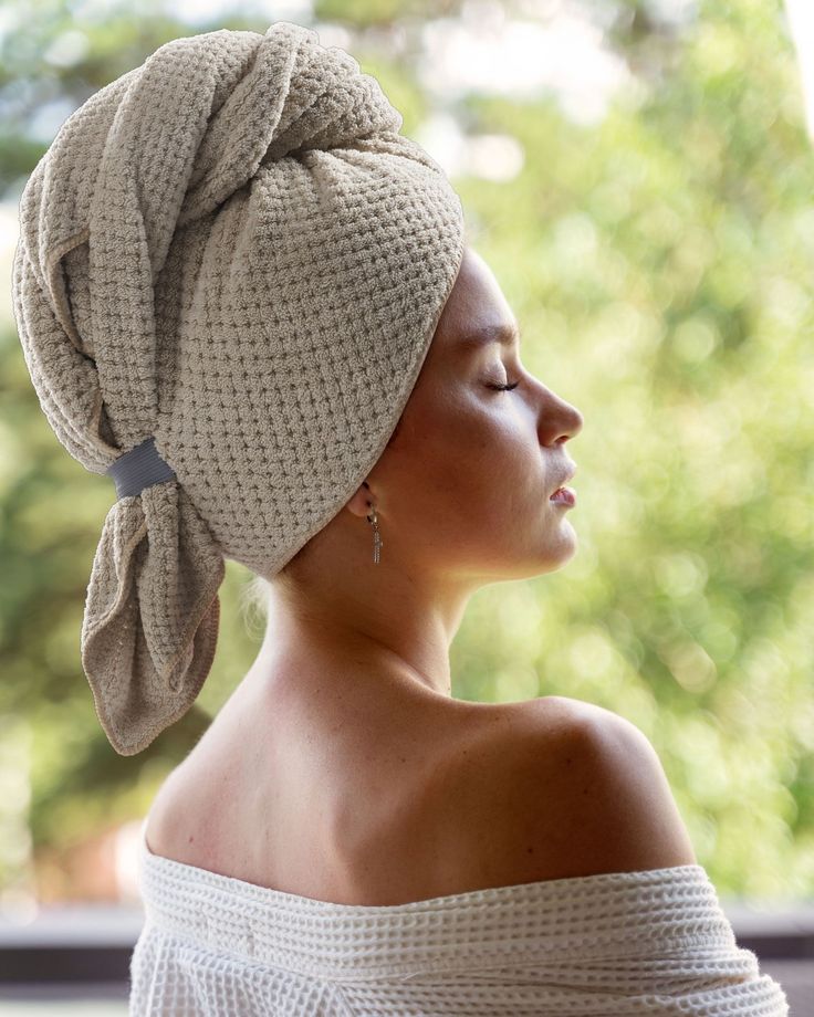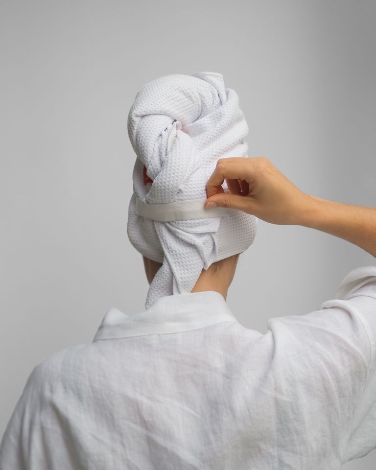 Efter tvätt lutar du huvudet framåt, placerar handduken runt håret och fäster den på plats. Låt den sitta medan den absorberar vattnet – utan att gnugga.